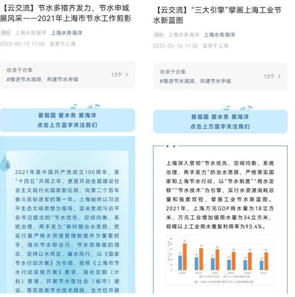 制作发布“建设节水型城市,推动绿色低碳发展”“建设节水型申城,推动城市节水减排”主题海报和节水宣传口号,以图文并茂的“云开幕”形式正式拉开丰富多彩的“云”上宣传周活动序幕。此次宣传周期间解放日报、文汇报、新民晚报和澎湃新闻等传统和新媒体齐发力,从不同角度对活动进行了报道。