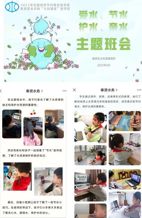 奉贤区四团幼儿园为大班的孩子们展示了一堂以“爱水、节水、护水、亲水”为主旨的线上主题班会。孩子和家长一起观看学习节水视频,深刻认识节约水资源、保护水资源的重要性,学到很多日常节水小技巧,小手牵大手表达了要关心水、爱惜水、保护水的决心。