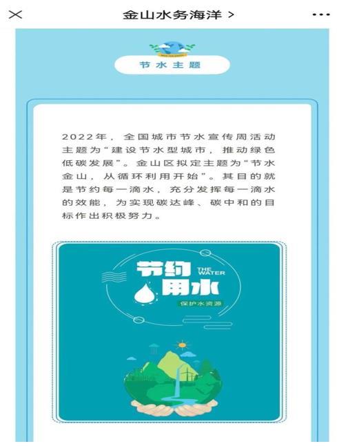 金山区提出“节水金山,从循环利用开始!”,倡导人与水和谐发展,共同建设碧水家园,宣贯《公民节约用水行为规范》,传播节约用水文明理念。