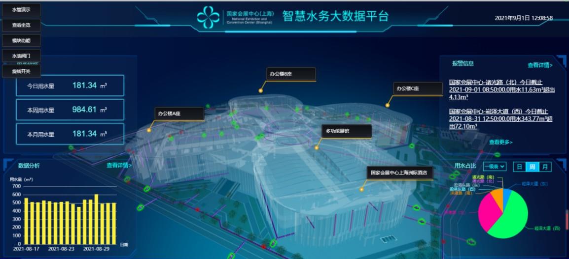 国家会展中心是由商务部和上海市政府共建的大型会展综合体,由展览场馆、配套商业中心、配套办公楼和配套酒店四大部分构成。国家会展中心可展览面积达60万平方米,单位建筑面积耗水量为3.3升/(平方米·天),低于《上海市用水定额(试行)》(沪水务[2019]1408号)中“会展中心”用水定额先进值3.6升/(平方米·天)的标准。