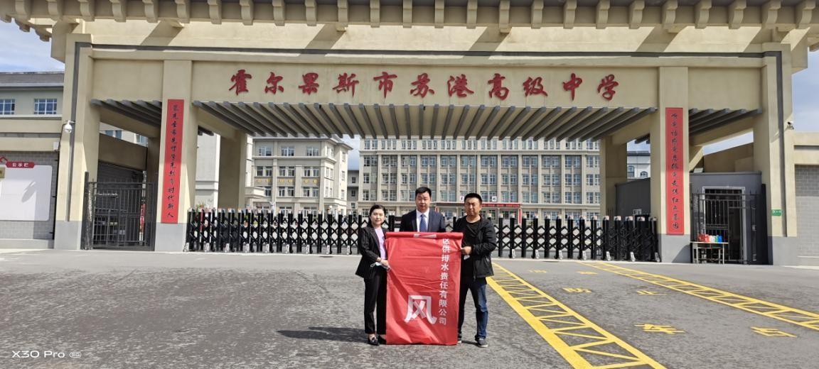 2022年6月2日,霍尔果斯经济开发区供排水有限责任公司副经理张春霞和水厂厂长吴新平为霍尔果斯市苏港高级中学即将高考的学生送去祝福。