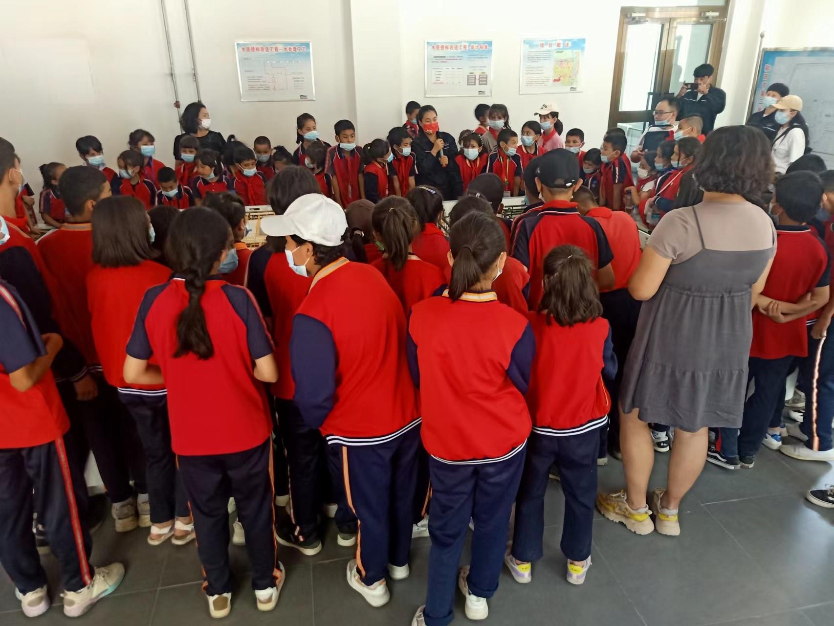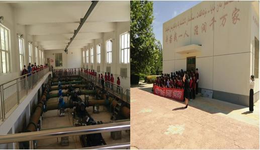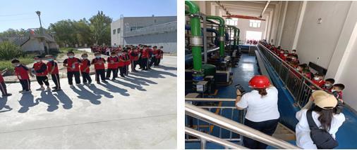 图为孩子观看加压泵房和供水车间,结束后在泵房外合影留念,结束美好的科普活动。