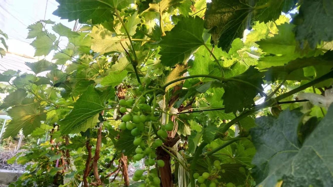 走进头台乡汪家庄子村方见新家的葡萄园,翠绿欲滴的葡萄藤爬满支架,果实圆润饱满,犹如一颗颗绿宝石挂满枝头。
