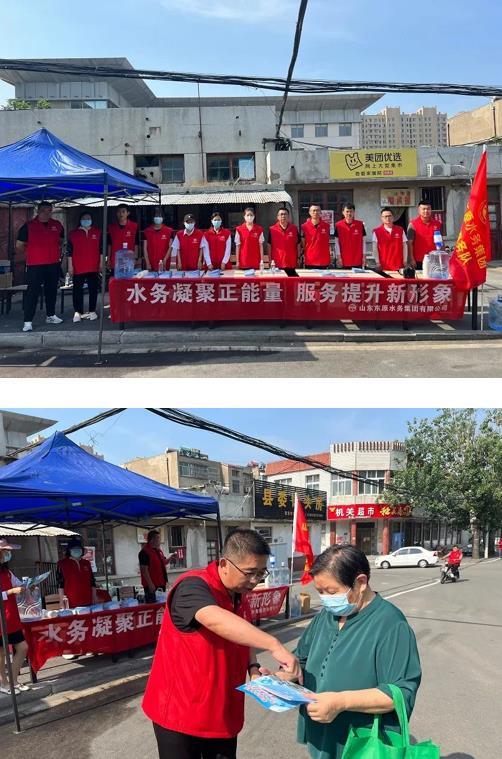 为普及用水知识、用水服务项目、收费执行标准及饮用纯净水宣传。6月25日上午,东原水务集团在县委家属院组织开展了“水务凝聚正能量服务提升新形象”供水服务进社区活动。网格员积极组织居民前往参与,活动现场,一位大姐问道“如果平时遇到水管爆裂或者突然停水的情况怎么办?”志愿者耐心解释道:“如果遇到以上问题,可拨打0538-2821872,这是我们的供水服务热线,可根据实际情况提供上门维修服务”。