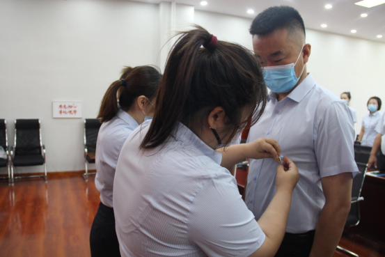 (为新党员佩戴党徽)
