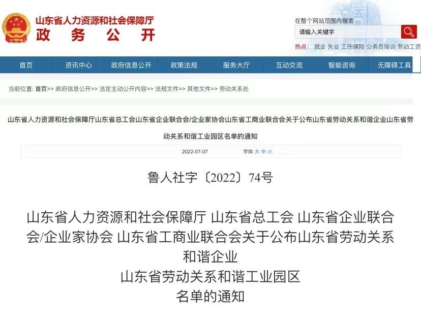 邹城公用水务有限公司荣获“山东省劳动关系和谐企业”荣誉称号