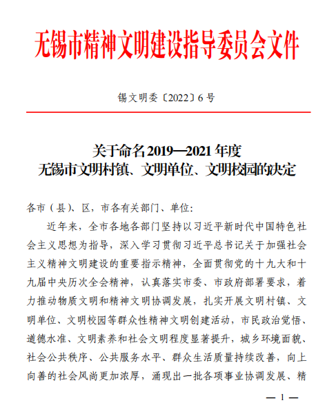 近日,无锡市精神文明建设指导委员会办公室印发《关于命名2019—2021 年度无锡市文明村镇、文明单位、文明校园的决定》,无锡市水务集团有限公司荣获“无锡市文明单位”称号。