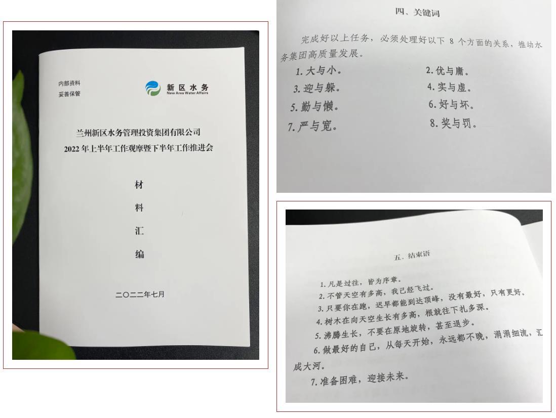 集团党委委员、工会主席陈占聪同志首先作2022年上半年党建工作报告。全面总结了集团“12345”党建工作法与国企改革、供水保障、企业文化、绩效考核、内部巡察等工作深度融合的成果。党委委员、监事会主席杨斌同志从成本、利润、现金流等方面详实通报了上半年集团经营情况,并提出下半年经济工作具体要求。