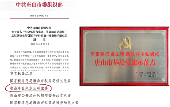 红色七月点亮信仰,供水战线党旗飘扬。近年来,唐山市自来水公司强化政治担当,锚定“牢记嘱托当先锋,英雄城市党旗红”目标,打造“党建+”红色引领,以高质量党建引领供水事业高质量发展。公司连续多年荣获“市级文明单位”“先进基层党组织”。2018年,营业处赵庄服务所荣获“全国青年文明号”,2018年公司党委荣获“市级基层党组织建设示范点”,省、市学雷锋活动示范点。2019年荣获唐山市思想政治工作先进集体,2020年公司荣获河北省诚信企业,省级文明单位,2021年荣获住建部“双百”先进典型。