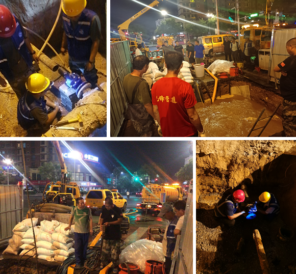 公司提前发出停水通知,做好现场施工准备,打破常规,调配4支管网抢修队伍支援集中攻坚,与总包单位协同作战。公司经理唐雨青带领技术人员现场指挥,40余名抢修队员有序分布到10处作业点位,按照制定好的施工方案稳步推进。