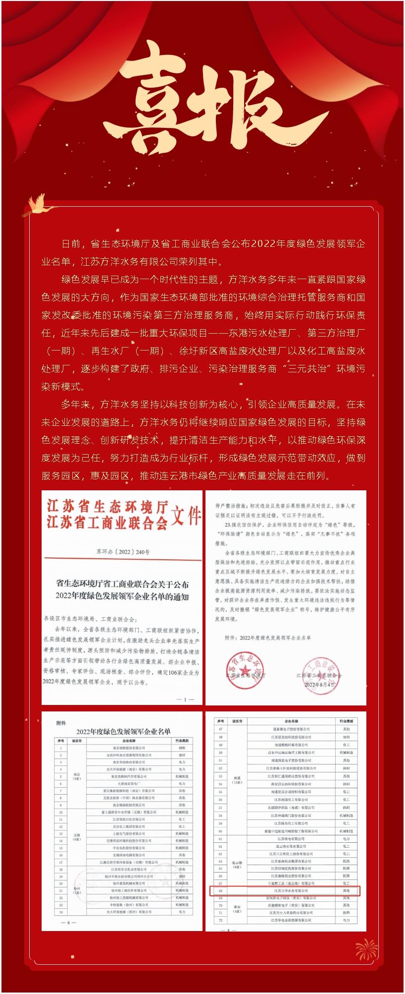 江苏方洋水务有限公司荣获“2022年度绿色发展领军企业”称号