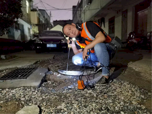 他们一步一顿,每走一步都把地探探头往前甩,步履有些机械,神情却很专注。钻树丛、翻井盖、俯身入井,忍受着高温、蚊虫,守护着城市“水脉”。