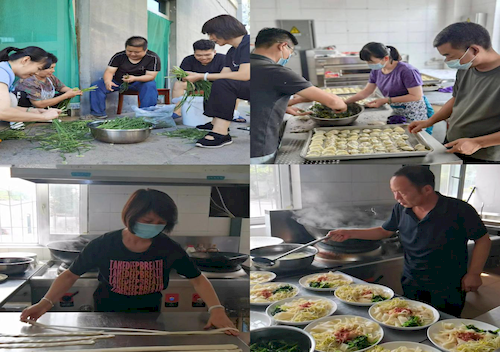 为保障值守人员就餐,供水公司食堂工作人员及时到岗,他们以食堂为家,与锅碗瓢盆相伴,舍小家为大家,当仁不让却甘居幕后,坚信做好一日三餐,也是为战“疫”做贡献。“每天早7点我们就起来准备,一日三餐,荤素搭配,饭菜尽量做到不重样,虽然辛苦些,但也想为疫情防控工作贡献自己的力量,希望疫情早日结束”食堂大师傅白菊花说。疫情期间,安全就餐、营养搭配、科学饮食,容不得丝毫疏忽,后勤组每天在做好疫情防控、安全卫生的前提下,想方设法做好每天的饭菜,尽最大努力保证大家营养均衡,吃上“放心饭”。期间,党支部书记、经理梁海军为给大家调剂口味,化身“大厨”,亲自上阵亮出“手艺”,从和面的要求,到豆芽儿、菠菜等辅食食材的准备,以及制作的工艺流程,每个环节他都样样把关,给大家烹制出了色香味儿俱全的家乡特色美味——油泼扯面。同时,组织值守单位的工作人员在不影响正常工作的前提下积极支援后勤工作,缓解食堂人手不足的压力,保障用餐正常。