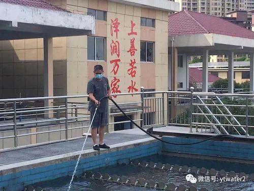 图为江北水厂运行班长袁冬姩在综合池冲洗水池