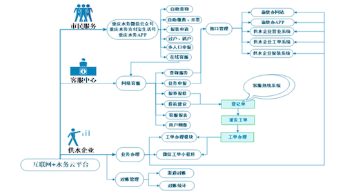 为了响应国家关于优化营商环境、推进互联网产业的号召,通过引入云、大、物、智等高新技术,重庆远通建设完成了 “互联网+水务云”平台。该平台按照“统一接入、统一受理、分级处理”的原则运行,采取“前台统一受理、后台分级处理”的业务处理模式,实现对电话语音呼入、智能客服问答、座席接入、用水业务预约、工单处理、值班管理、绩效考核与决策分析的全流程管理,实现了“群众少跑腿、数据多跑路”的综合服务平台建设目标。做到了知用户所需、解用户所难,让用户不再奔波于不同业务部门,无需重复诉求,最终实现足不出户一站式解决用水服务问题。