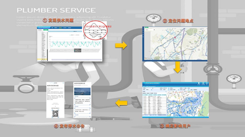 (一)主动式数据分析,提前预警供水问题。以水务集团大数据平台海量生产及运行数据为基础,实现内部分析。一方面,结合管网水力模型运算,通过实时运算,提前预知管网运行故障,精准定位故障范围;另一方面,及时发现重要水质情况、区域停水等,确定影响用户。将提前预知的信息及时通过微信、短信、公告等推送至区域供水用户,缓解客户服务压力。