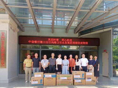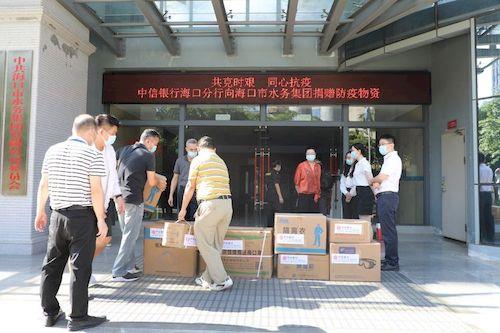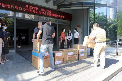 为驰援海口抗击疫情,助力保障城市运行,2022年8月23日,中信银行海甸支行向海口市水务集团捐赠抗疫物资,其中包括口罩6000个,医用防护服100套,医用防护面屏、护目镜各100个,医用一次性帽子300个,医用一次性鞋套300双,医用体温计、消毒液等防护用品。