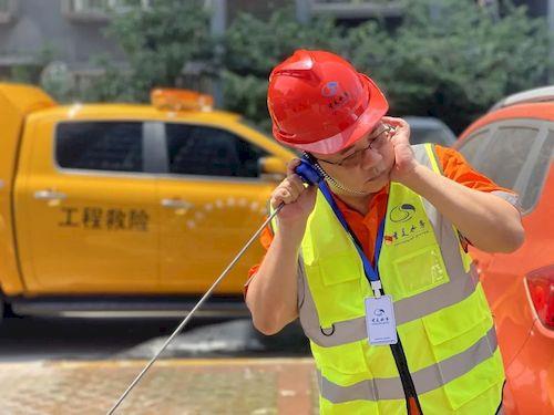 8月16日中午12:30分,太阳又毒又辣,畔山桃园小区4幢居民楼前的停车坝里,沙坪坝营管所管网科长、共产党员邓志伟此时正带领管道工人们为该小区反映地面渗水的问题进行细致的查漏工作。经过渗水区域及周边多处的试点测漏,“哗哗哗… …”一阵轻微、不易察觉的水流声被经验丰富的邓志伟敏锐捕捉,经过反复对比测试,最终确定了漏点。他摘下帽子,脸上汗如雨下,如同刚洗过脸一样,汗水流到了眼睛里,他也顾不上擦拭,转身叮嘱同事:“赶快通知抢修队伍,告诉他们漏点已找到,提前做好抢修准备,抓紧抢修进度,老百姓的正常用水一刻也不能耽误。”