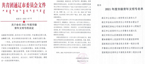 8月17日,共青团通辽市委员会发布“2021年度市级青年文明号”评选结果。其中,通辽市城市供水有限责任公司西售水营业厅上榜。