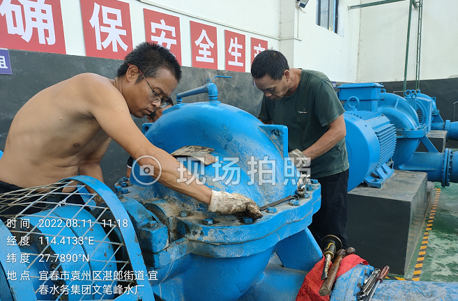 送水泵房是自来水厂制水工艺段的最后一环,自来水将从这里输入管网,从而流向千家万户。经过泵房的水量虽然大,却不能给检修人员带来一丝丝清凉。四十多度的泵房犹如一个巨大的蒸笼,人在里面哪怕只是静站一会儿也会汗流浃背。但检修人员偏不服“暑”,丝毫没被闷热的环境所影响,他们配合默契,分工协作——打磨零部件、安装轴承……为的就是确保设备的完好率,不让供水设备在高峰供水的特殊期间“战斗减员”。