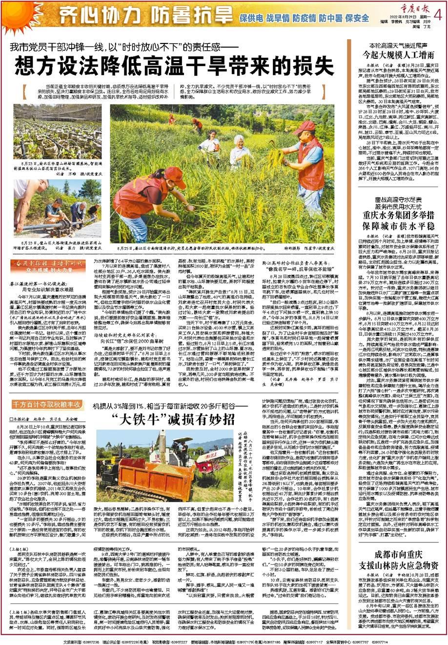 本报讯 (记者 崔曜)我市极端高温天气已持续近两个月时间,加上旱情、疫情等不利因素同时叠加,对城市安全供水保障体系形成了巨大压力和严峻考验。8月28日,重庆日报记者获悉,重庆水务集团对此采取多项硬举措、新路径,主动扛起国企担当、全力以赴鏖战高温,有力保障了城市供水正常。