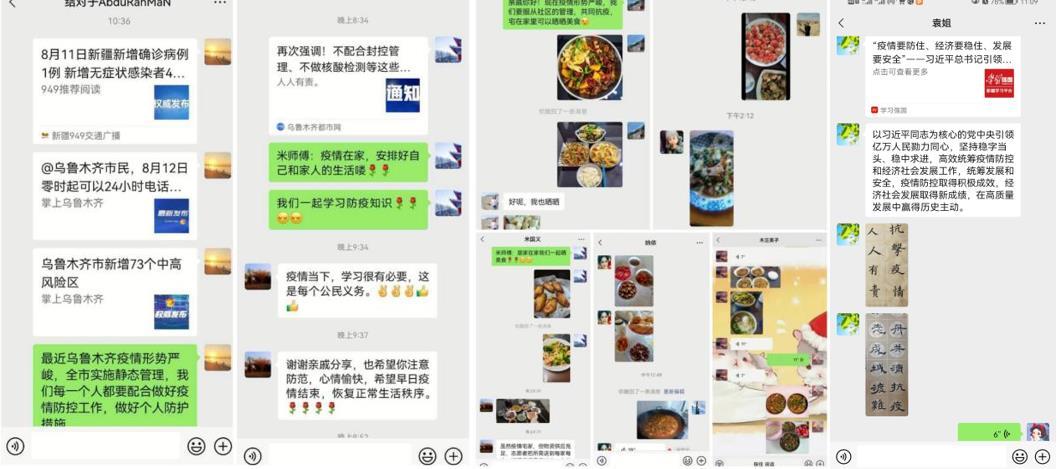 为尽快阻断疫情传播蔓延,防范疫情风险外溢扩散,8月10日起乌鲁木齐市重点城区实施疫情防控静态管理措施。疫情无情,虽然阻断了各族同胞相融与共的美好时刻,人却有义,“宅家”使各族同胞展现了石榴花开的别样风采。大家晒美食、秀才艺、送问候、同学习,相互鼓劲,更加广泛地凝聚起众志成城、团结一心、战胜困难的信心与决心,展现着各民族手足相亲、守望相助、共渡难关的民族情、团结爱,进一步筑牢疫情防控攻坚战的坚固堡垒。