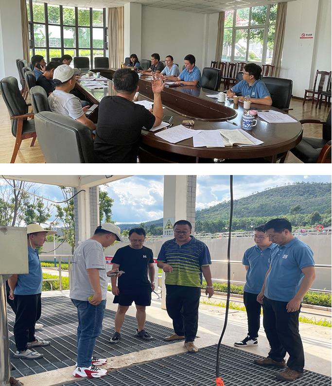 随后全体参会人员来到第二污水处理厂现场,查看了一二期旋流沉沙池、出水口、污泥回流泵房等需要主要技改的设备情况,并返回到第一污水处理厂现场实地查看需要技改部分,再次与中南市政设计人员及中交楚雄公司讨论技改方案。