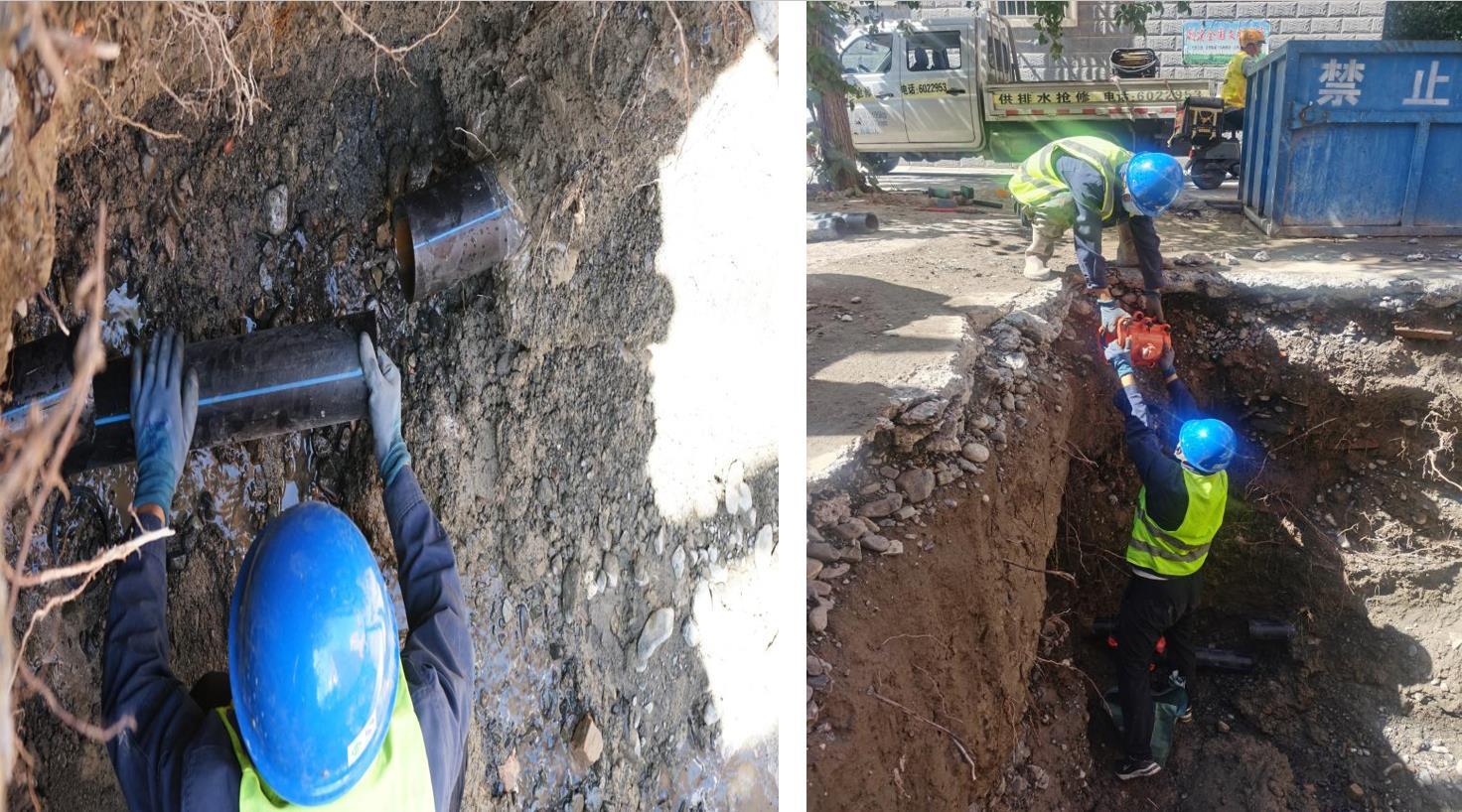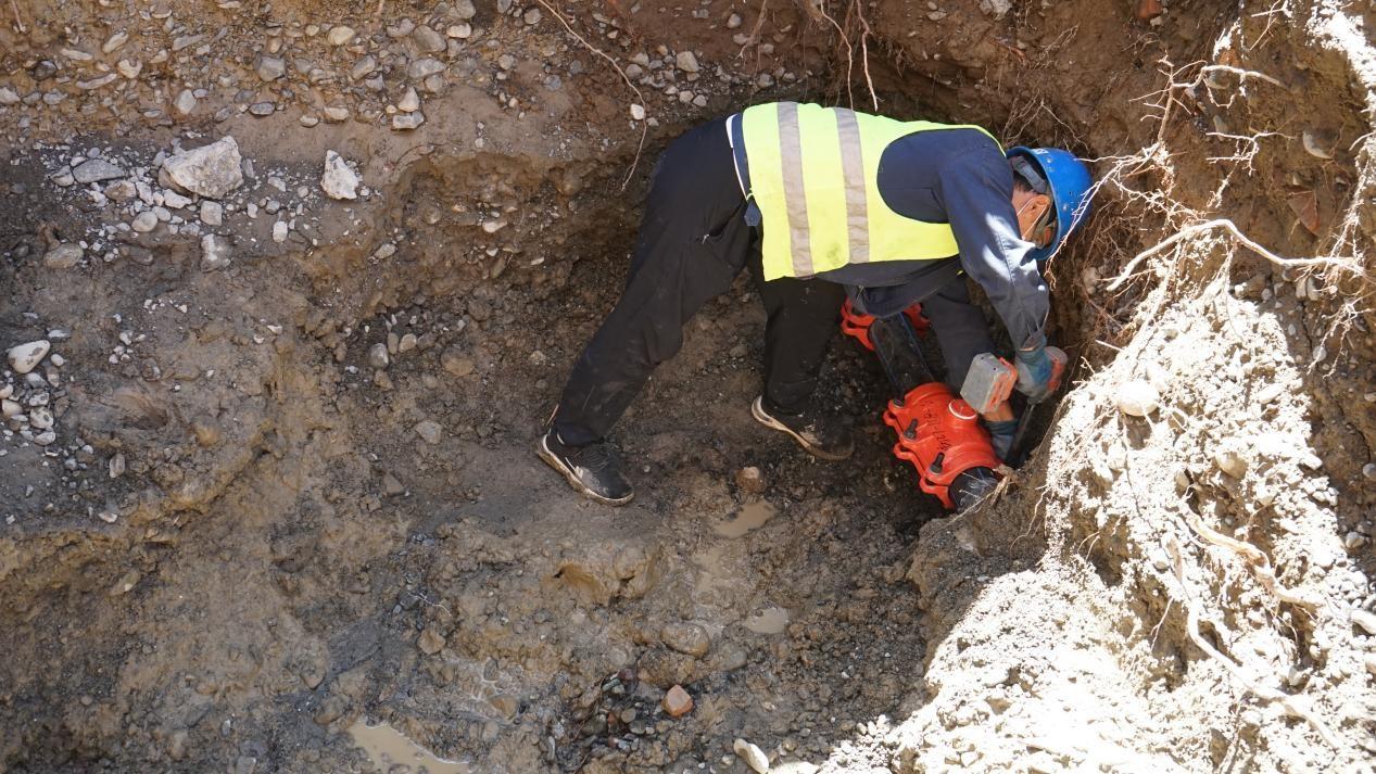 抢修人员立即调来挖机和抢修设备,先是组织人员进行停水,清理基坑内的积水,在临近管道漏损处进行人工开挖,用DN300哈夫节对管道破损点进行修复,经过近2个小时的紧张“奋战”,终于在下班前修复好破裂水管,保障了丰和苑小区及周边市民的正常用水。