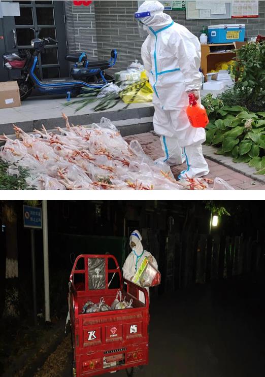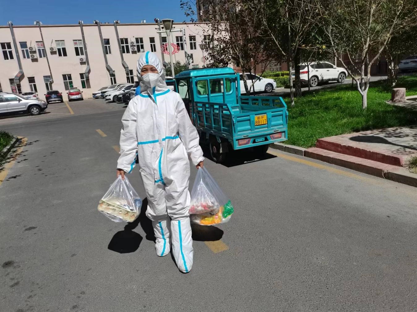 为了能让居民度过一个温暖、祥和的中秋佳节,伊宁市自来水有限公司下沉香水湾宁远郡小区志愿者蒋晓芬提前为居民采购物资,为3个单元187户居民配送了120只鸡,180个蔬菜包。由于采购的鸡数量较多,要一家家的送去,时间来不及,天气又比较炎热,难免会引来蜜蜂、苍蝇,蒋晓芬就站在烈日下左手拿着消毒壶消杀,右手拿着榆树条不停的挥舞,居民站在窗前等待自己节日的食材,看到这暖心的一幕,深深的被这名志愿者感动,不停的在楼栋群里表示感谢。