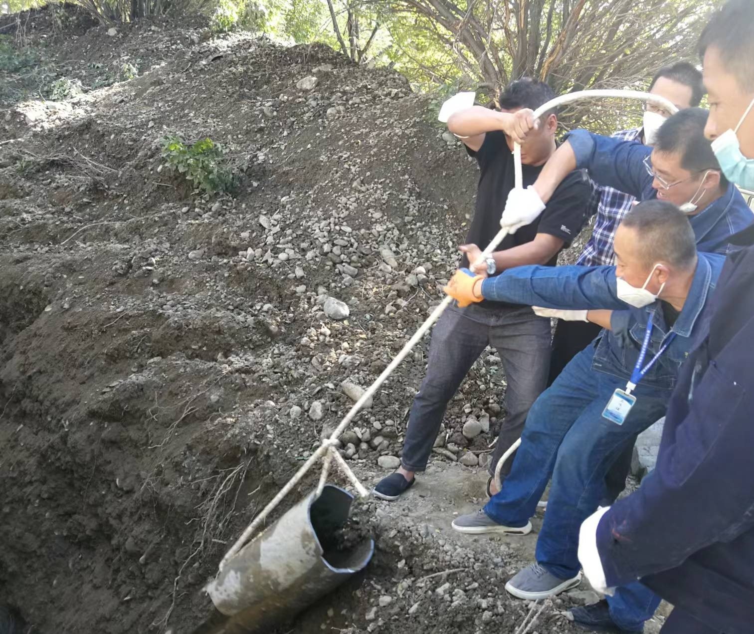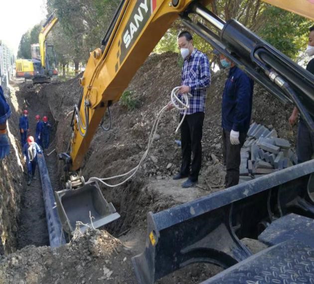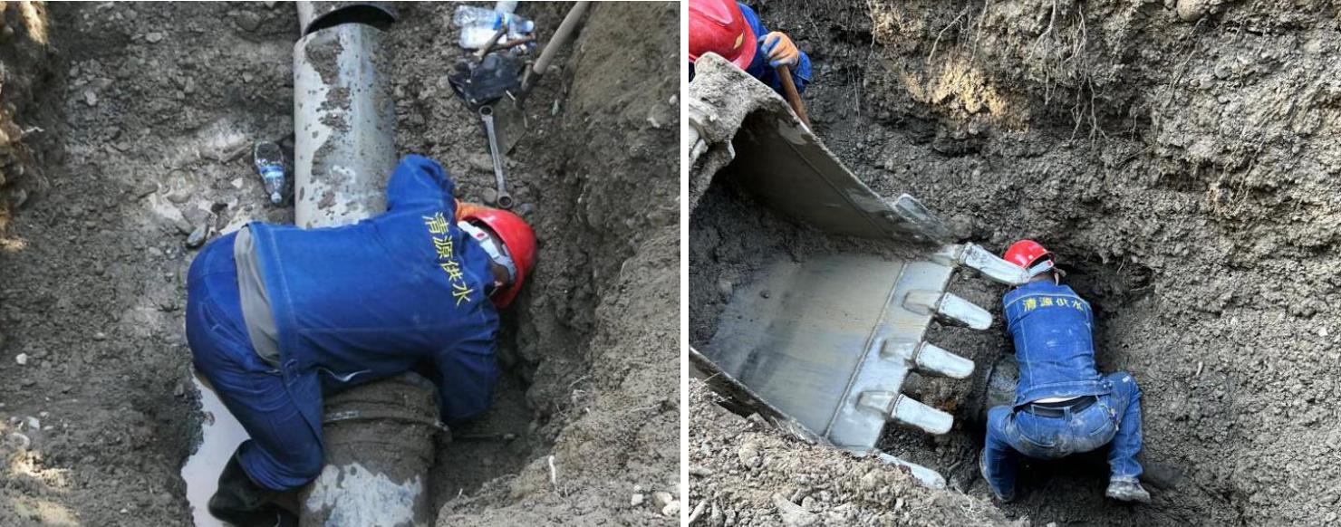 抢修现场分工协作,一边组织人员关停相关闸门,一边协调机械设备开挖作业坑道,具备作业条件后,维修人员进入混杂着污泥的坑道连续作战十余小时后修复了破损管道,恢复通水。