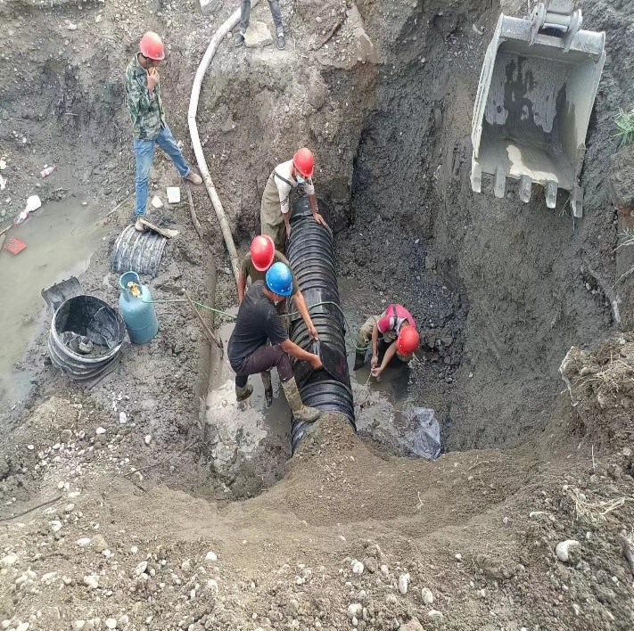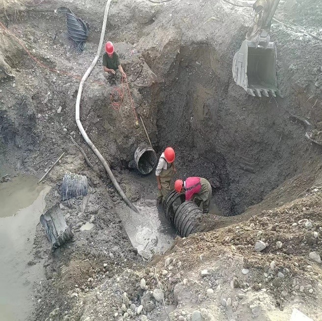 2022年9月27日,接市民电话,反映墨林小区门前臭水外溢,疑似排水管网泄漏。公司立即启动应急预案,安排抢修人员赶赴现场察看,经过对现场情况的初步勘察,确定为此处DN600排水主管网老化破损漏水所致,随即制定抢修方案,展开抢修。开挖后发现管网多处漏点,根据多年的抢修经验,实时调整了抢修方案,采用钢带管更换损坏管网方式进行修复。因近期,当地疫情防控形势严峻,城区部分区域实施了临时静态管理,为做好疫情防控工作,迅速构筑坚韧抗疫防线,加之供水、排水又是疫情防控的重要环节,按照上级部署要求,多措并举推动疫情防控工作做实、做深、做细。每一个施工环节都不可掉以轻心,相关部门专业人员也对此处的污水进行了采样检测。