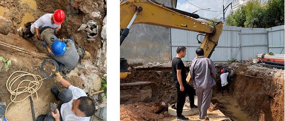 现场大型挖掘机首先开沟挖槽,施工人员将管道下放到挖好的沟槽内,再进行管道安装,施工人员分工明确。在施工过程中,供排水公司严格做好施工安全管理及文明施工,施工区域布置施工围挡、架设指示牌、安装夜间指示灯等措施来保证施工安全及过往人员人身安全。