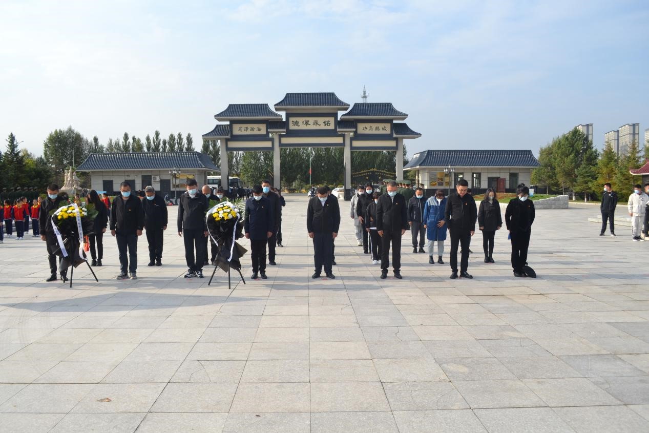 在庄严肃穆的陵园内,路旁笔直的青松威严耸立,树下的花儿开的格外美丽,陵园正前方是一座高大的革命烈士纪念碑。全体人员整齐列队、庄严肃立,向革命烈士鞠躬默哀,并由职工代表敬献花篮。
