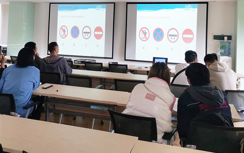 第五工会小组共派出6支队伍,裁判组宣读完比赛规则及考试要求后比赛正式开始,大家认真的看着PPT中各种场景的标识牌,默默在答题纸上写下心中的正确答案;周围观众也仔细看着PPT中一个个赛题在心中默记学习着。比赛专注而紧张,当裁判组宣布考试时间到时,大家停笔交出答案。