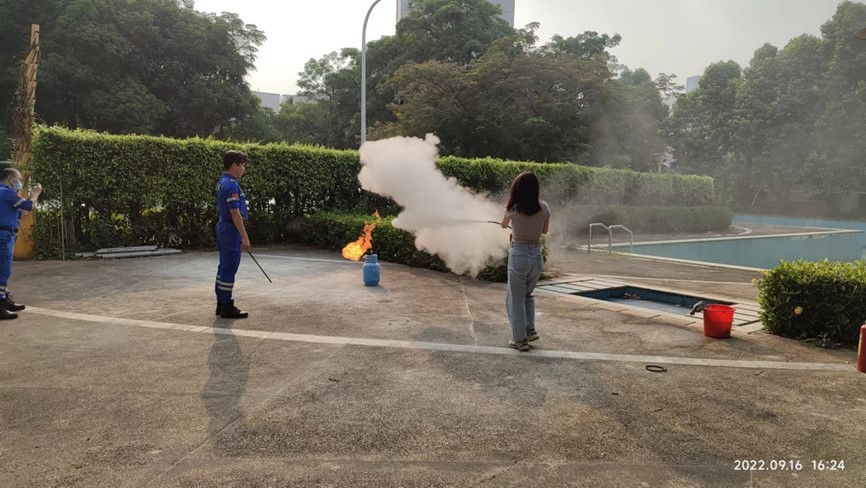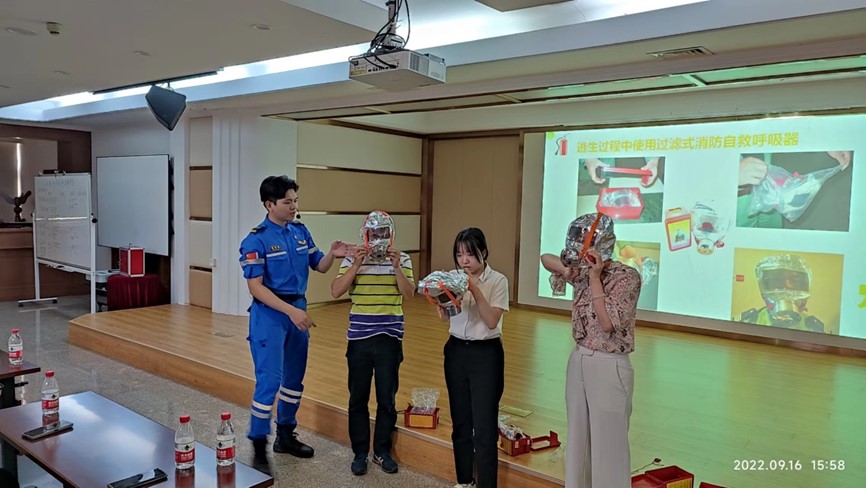 随后,消防培训讲师就消防逃生面罩和灭火器的使用方法进行示范教学,着重强调消防逃生面罩和灭火器使用步骤和注意事项。中山公用水投公司员工代表踊跃上前体验,规范有序地完成消防逃生面罩佩戴和灭火演练,对消防逃生面罩和灭火器有了更直观的认识和操作能力。