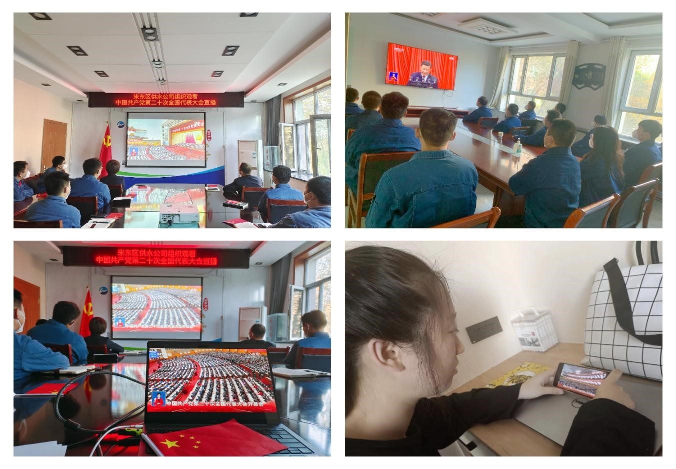 九万里风鹏正举,千秋业华章续谱。金秋十月,全党全国各族人民万众期盼的中国共产党第二十次全国代表大会在北京隆重开幕。为迎接中华民族伟大复兴历史征程上又一个特殊而重要的时刻,乌鲁木齐水业集团米东区供水公司党支部结合当前疫情形势,组织单位值守人员、居家人员通过集中和自行观看的方式认真收听收看党的二十大开幕盛况,第一时间学习领会党的二十大报告精神。