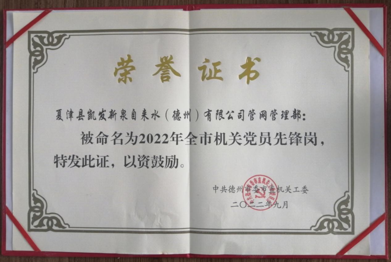 近日,德州市直机关工委对全市机关党员先锋岗、服务群众标兵进行表彰,凯发新泉自来水德州有限公司管网管理部荣获2022年全市机关“党员先锋岗”称号!