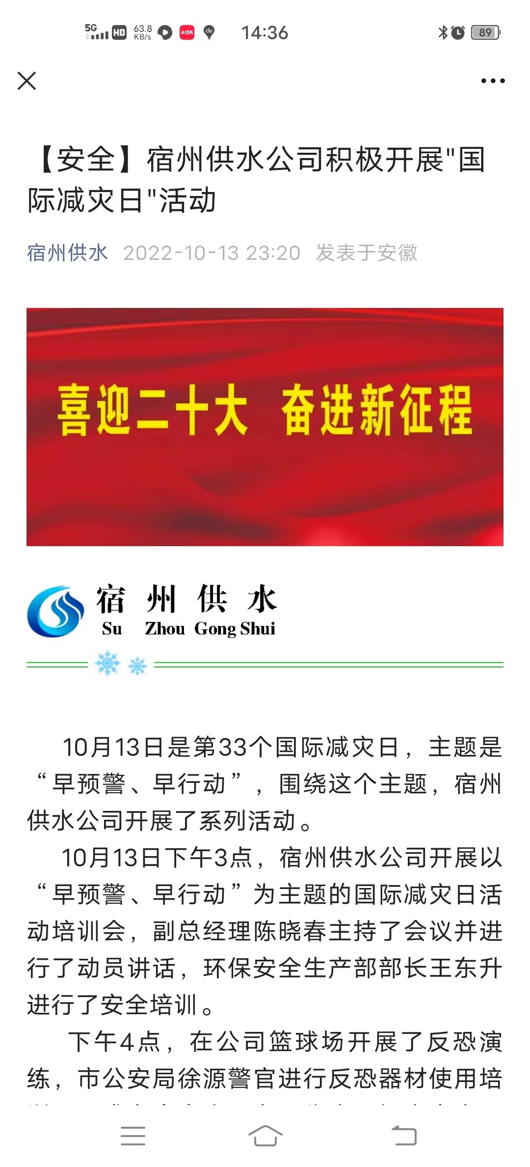 10月13日是第33个国际减灾日,主题是“早预警、早行动”,围绕这个主题,宿州供水公司开展了系列活动。