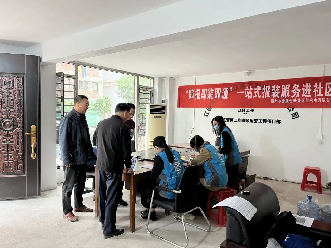 活动前,该公司联合茅店镇义源村委会提前在村务群发布“即报即装即通”一站式报装服务进社区活动信息,约定上门服务时间,主动把窗口下沉前移,在安置区现场搭台办公,受理用户用水报装、分户、咨询等业务。