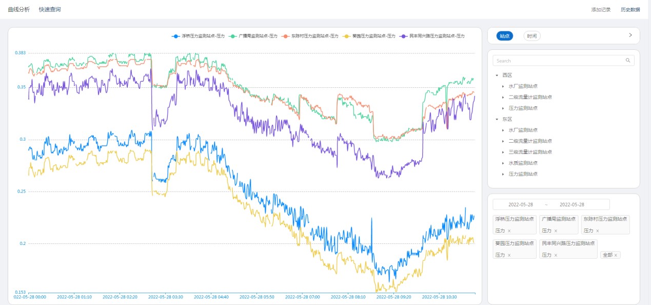 目前管网在线监测一级站点6个,二级站点106个,三级站点34个,管网末梢水质监测3个。多采用微功耗超声波流量计、压力表及基于物联网的微功耗DTU/RTU,大部分站点采用太阳能加蓄电池的供电方案,实现一分钟一采集,一分钟一上传的采集密度。保证数据的及时性。