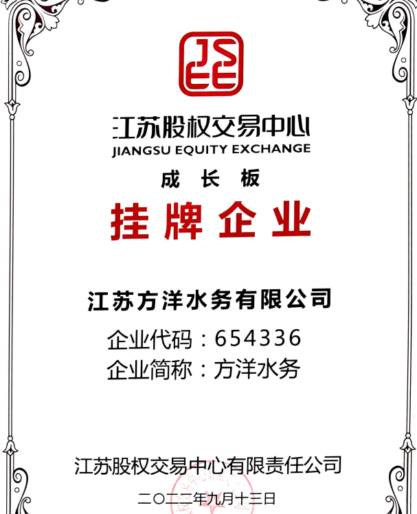 方洋水务成功挂牌2022年江苏股权交易中心成长板企业