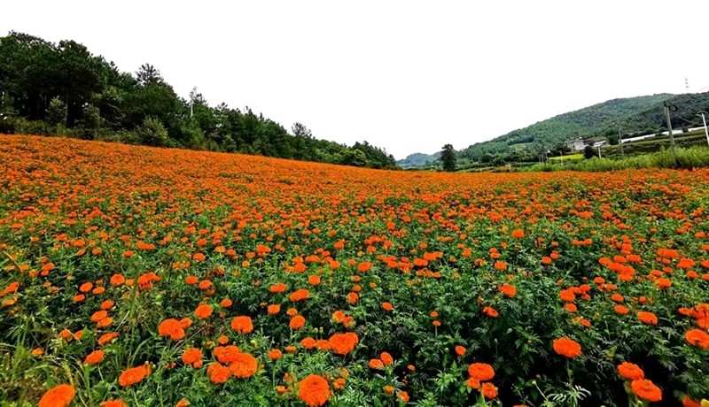 万寿菊容易栽种、易成活、好管理,花朵含有丰富的叶黄素,提取制作的天然色素可广泛用于食品、饮料、医药等领域。花期一般在3个月左右,7月中旬至10月为采摘期,一季可分批采摘7到10茬,平均每亩产量可达3至5吨,除去人工成本、籽种、化肥,每亩可以增收2000元以上。