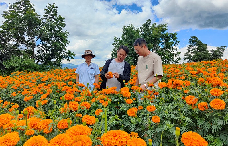 2021年底,在禄劝县委、县政府的努力下,引进了昆明立达尔农业开发公司,在全县范围内推广种植万寿菊。新山村“两委”与驻村工作队在云龙乡党委、政府的领导下,积极响应,到村到户进行万寿菊种植宣传。在立达尔公司承诺与种植农户签订保底收购协议,统一提供花苗、农药、化肥、栽培采摘技术培训前提下,部分农户还是心有顾虑,从一些外地亲朋、外出务工人员打听到,万寿菊亩产不高、收购价不稳定等等消息,不愿意尝试种植,推广工作停滞不前。为此,清源公司驻村干部许斌同志多处奔走了解万寿菊在文山的实际种植情况及市场信息并成功开拓了文山地区客户,他及时将相关情况与村“两委”成员进行沟通。多次村组干部、大员、村民代表召开专题会议,在村干部中树立信心,动员带头种植,利用日常走访日及村民小组会议,做村民思想工作,特别是未外出务工的脱贫户、监测户,与大家一起分析利害。在驻村工作队、新山村“两委”及村干部的努力下,新山村发动97户农户,种植万寿菊500余亩。