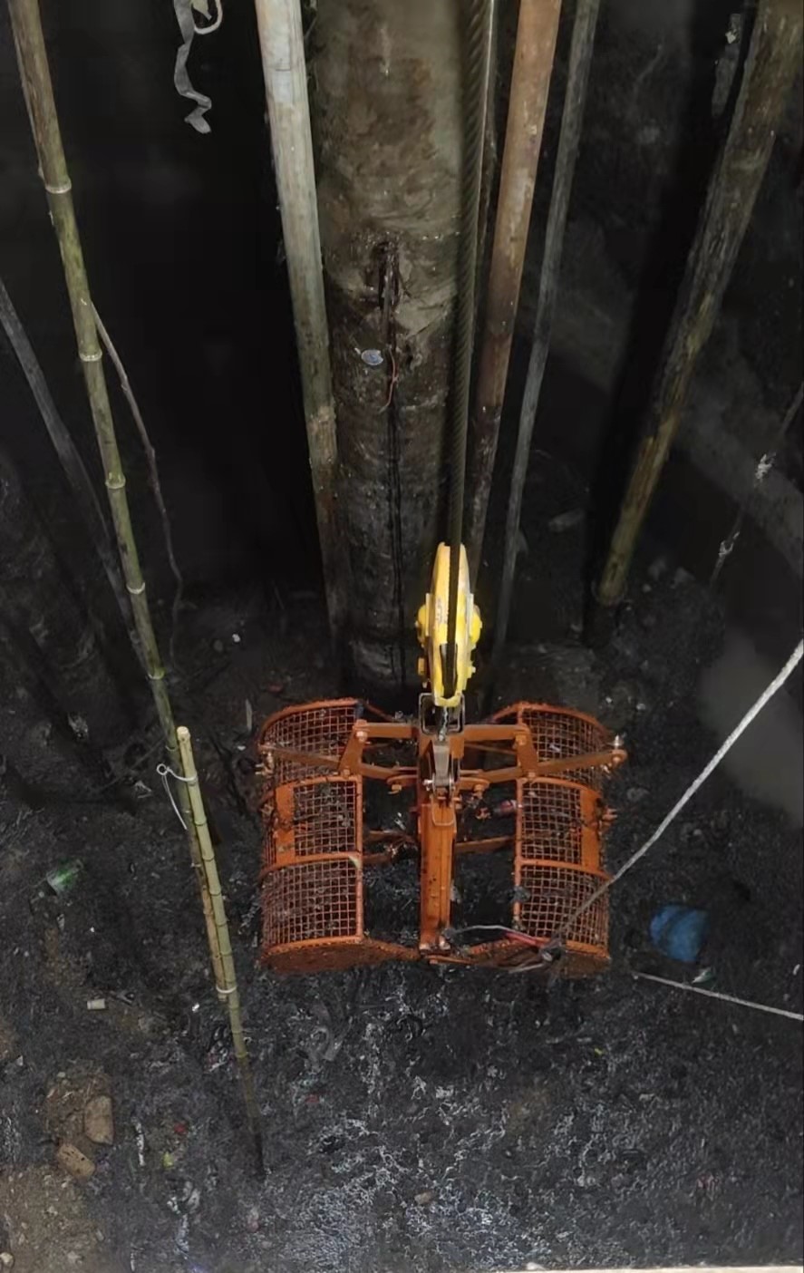 本工具是雨污水泵池飘浮垃圾打捞清理专用抓斗,抓斗利用电动葫芦等吊装设备,以打开状态下落至泵池水面垃圾处,地面人员通过绳子操作开关销子控制抓斗闭合抓取,提升时中间导杆自动收紧防止垃圾散落,提升后可直接装车转运。在实际使用过程中,抓斗可加快垃圾打捞速度、减轻打捞工作强度;清理打捞人员不用进入泵池内,避免打捞过程中吸入有毒有害气体、缺氧窒息,深井施工物体打击、机械伤害、高温高湿等有限空间作业安全风险。