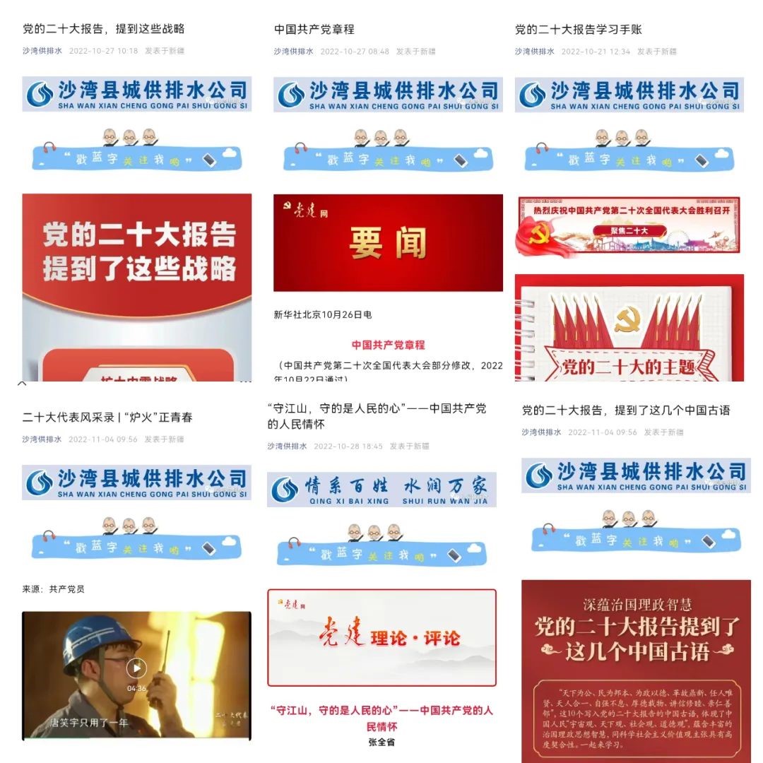 连日来,沙湾市供排水公司全体党员干部职工积极开展丰富多彩的主题活动,推动党的二十大精神在公司落地生根,汇聚踔厉奋发、勇毅前行合力。