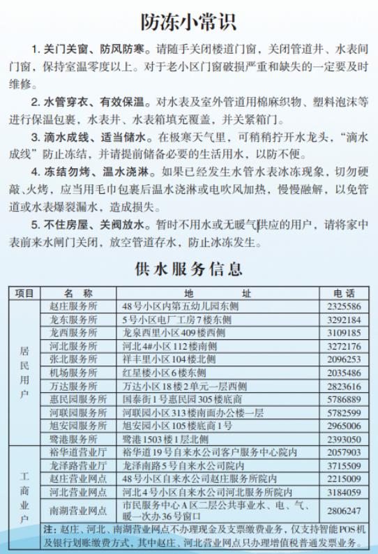 公司利用市内各大官方媒体以及“唐山水司”微信平台、唐山供水网等媒介,加大冬季用水防冻宣传;针对重点小区及工商业用户,逐一进行电话提醒,点对点讲解供水防冻常识;在疫情防控允许的条件下,组织小区服务所人员适时开展防冻服务进社区宣传活动,发放《防冻通知》宣传单,广泛提醒用户采取必要措施做好水管水表的防冻保温措施。