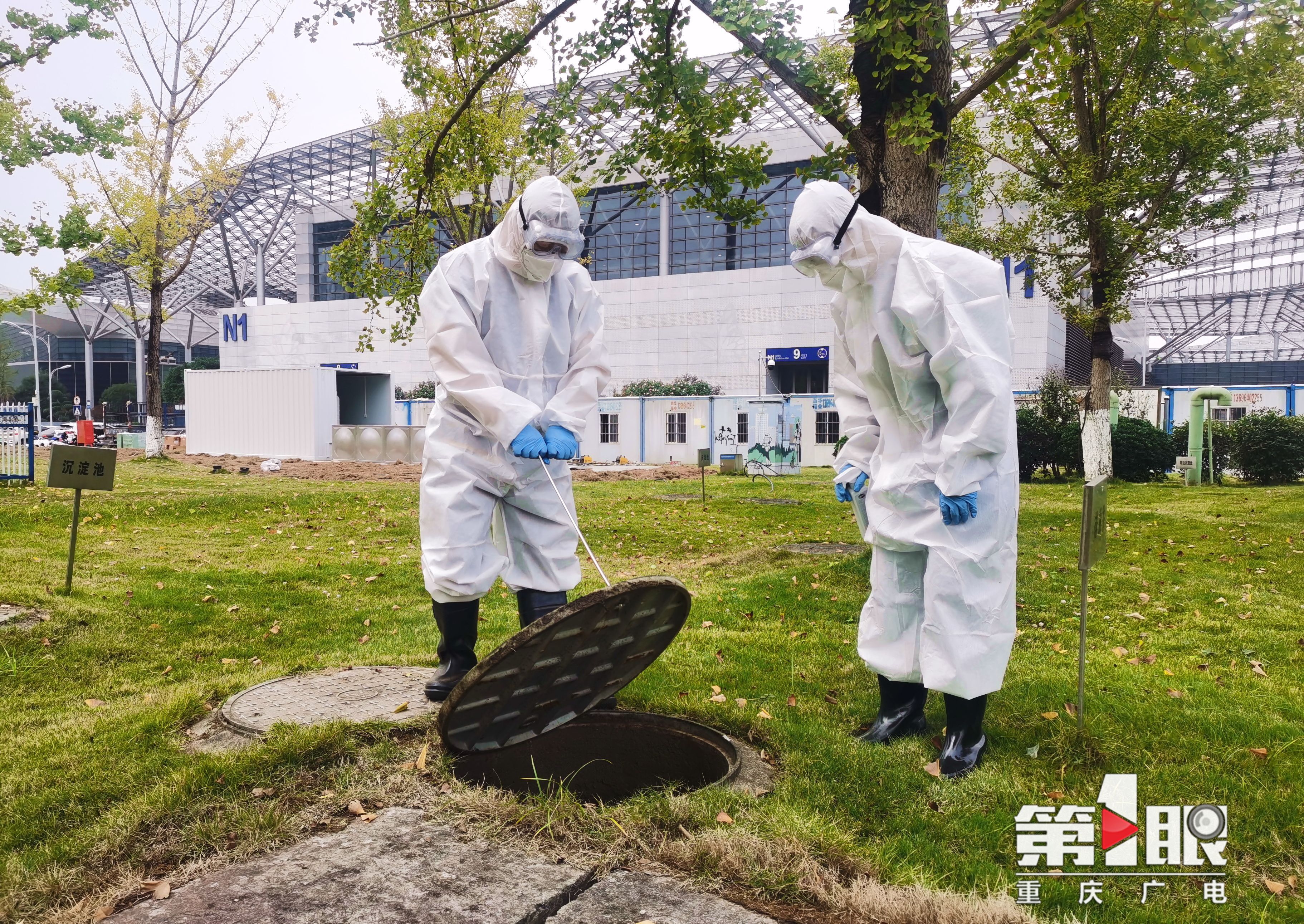 (图为悦来排水公司工作人员正在检查方舱医院外下水道排污情况)