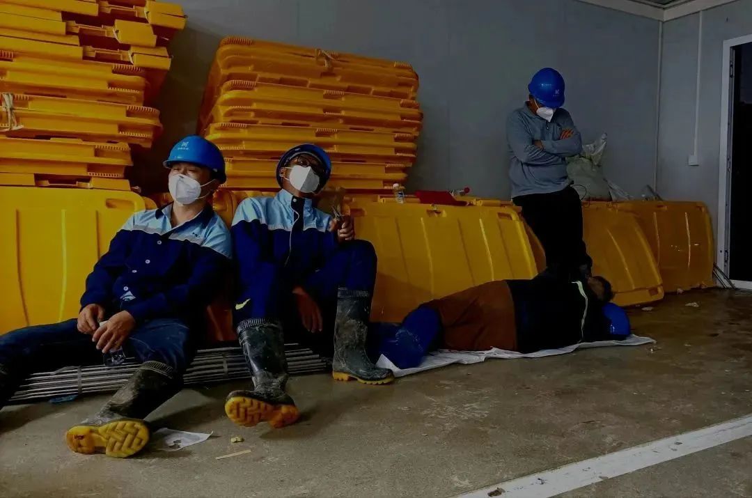 为了抢抓工期,建设团队吃住都在现场。由于附近没有餐饮,大家吃东西要到几公里外的村镇买。“现场运输车辆经常排起几公里的长龙,买到早餐回来,已经是午餐的时间了。”轮班结束,大家饿了就简单冲冲手,站着捧起早已不热的盒饭开吃;困了,找个地方靠着或者在地上铺个塑料布就睡,有的干脆连安全帽都不摘……