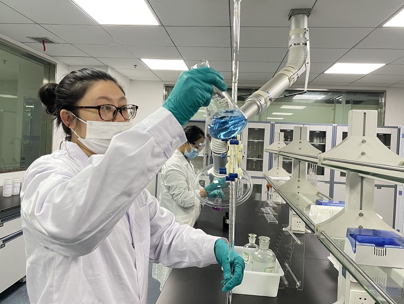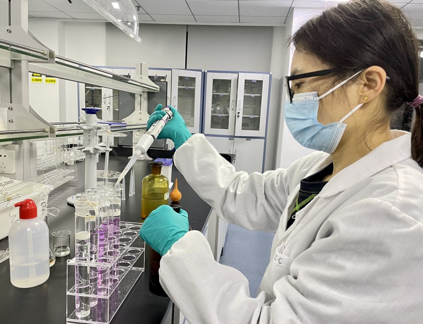 (水质检测公司供水检测部员工冯琳用滴定法检测水中总硬度的含量,中共党员胡晓玲正在进行总硬度检测中的样品空白实验)