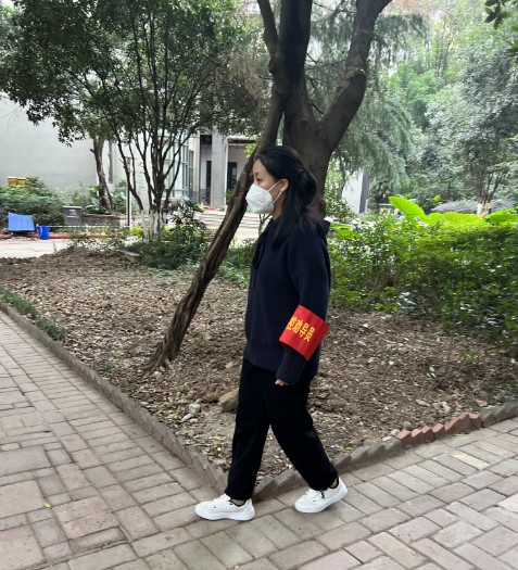 (水质检测公司供水检测部中共党员胡晓玲在龙塔街道鲁能东路社区鲁能星城七街区参加疫情防控志愿者服务,在小区楼道查看是否有逗留人员,并现场进行疏导)